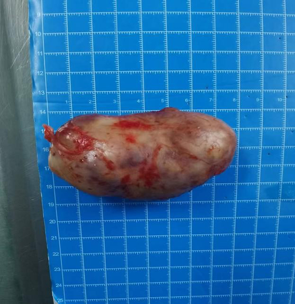 為減少手術(shù)創(chuàng)傷及考慮到患者及其家屬?gòu)?qiáng)烈要求,避免下頜骨暫時(shí)劈開(kāi),李家鋒主任、呂中靜博士在術(shù)前經(jīng)過(guò)周密考慮并制定詳盡的手術(shù)計(jì)劃,帶領(lǐng)團(tuán)隊(duì)成員通過(guò)頸外入路囊內(nèi)摘除方式成功摘除腫瘤。術(shù)中發(fā)現(xiàn)該患者為來(lái)源于迷走神經(jīng)的神經(jīng)鞘瘤,李家鋒主任、呂中靜博士及團(tuán)隊(duì)成員在手術(shù)實(shí)施過(guò)程中,精準(zhǔn)分離,充分保護(hù)頸內(nèi)外動(dòng)靜脈及迷走神經(jīng),該患者術(shù)后并無(wú)相應(yīng)的神經(jīng)癥狀手術(shù)并發(fā)癥的出現(xiàn)。該患者在術(shù)后1周順利出院。該手術(shù)的成功實(shí)施,不僅最大程度減輕了患者的身體傷害,降低了患者經(jīng)濟(jì)負(fù)擔(dān),還加速了患者術(shù)后康復(fù),縮短了術(shù)后康復(fù)時(shí)間。
