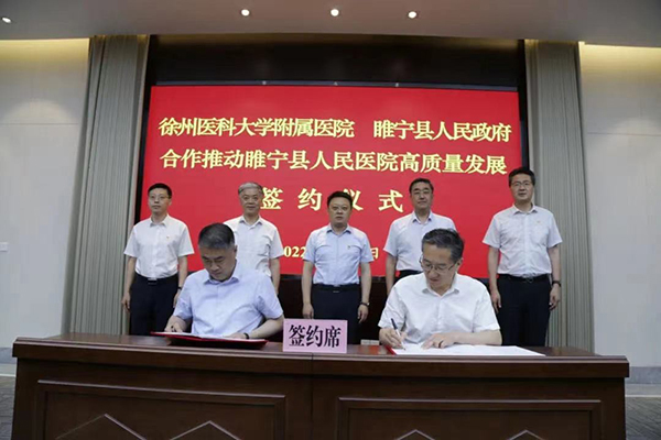 徐州醫(yī)科大學(xué)副校長、徐醫(yī)附院黨委書記王人顥,院長金培生、副院長徐凱、副院長燕憲亮,睢寧縣委書記蘇偉,縣委常委、常務(wù)副縣長陳楚出席簽約儀式。睢寧縣委常委、組織部部長張彌雷主持簽約儀式。