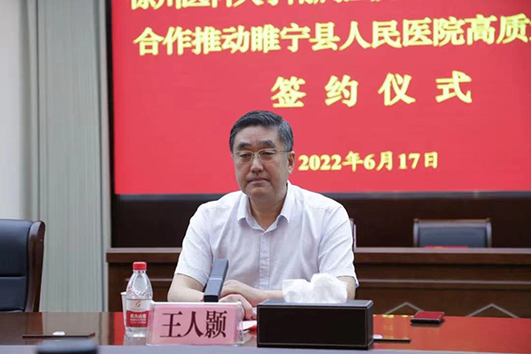 王人顥在致辭中向睢寧縣委、縣政府和睢寧縣人民醫(yī)院對徐醫(yī)附院的信任表示感謝,并向一直關(guān)心和支持合作的徐州市委、市政府,省、市衛(wèi)健委表示謝意!他表示,此次合作具有十分重大的現(xiàn)實(shí)意義和非常深遠(yuǎn)的歷史意義。他強(qiáng)調(diào),徐醫(yī)附院將秉承協(xié)議要求,為睢寧縣人民醫(yī)院輸送優(yōu)秀的專業(yè)人才、技術(shù)、管理理念,毫無保留地將徐醫(yī)附院高質(zhì)量轉(zhuǎn)型發(fā)展的經(jīng)驗(yàn)、成果和價值理念與睢寧縣人民醫(yī)院共享,建立合作共同體、責(zé)任共同體、管理共同體,傾力打造醫(yī)聯(lián)體“睢寧模式”,建設(shè)新時代的醫(yī)療聯(lián)合體合作的樣板。同時,對進(jìn)一步深化合作共建提出了具體意見:一、要發(fā)揮區(qū)域醫(yī)療中心輻射引領(lǐng)作用,推進(jìn)優(yōu)質(zhì)醫(yī)療資源下沉,建立合作共同體。徐醫(yī)附院將充分發(fā)揮人才、學(xué)科、技術(shù)、品牌、管理等優(yōu)勢,全面深化幫扶工作,統(tǒng)籌安排對接任務(wù),重點(diǎn)在學(xué)科建設(shè)、醫(yī)療服務(wù)、人才培養(yǎng)、信息共享、疾病防治等領(lǐng)域開展深度合作,滿足人民群眾多層次多樣化的健康服務(wù)需求,打通優(yōu)質(zhì)醫(yī)療資源與基層百姓阻隔,讓睢寧百姓在家門口即能享受到大醫(yī)院同質(zhì)化的醫(yī)療服務(wù)。二、要踐行“人民至上、生命至上”的理念,弘揚(yáng)新時代醫(yī)療衛(wèi)生職業(yè)精神,建立責(zé)任共同體。把提升睢寧縣人民醫(yī)院的醫(yī)療服務(wù)能力作為合作共建重中之重的任務(wù),變“輸血”為“造血”,結(jié)合睢寧實(shí)際,立足患者訴求,牢記辦院行醫(yī)初心,更好地滿足睢寧縣及周邊地區(qū)人民群眾日益增長的健康需求。三、要貫徹新發(fā)展理念,傾力打造醫(yī)聯(lián)體建設(shè)“睢寧模式”,把徐醫(yī)附院改革形成的價值理念融入縣人民醫(yī)院改革發(fā)展全過程中,形成管理共同體。進(jìn)一步健全現(xiàn)代醫(yī)院管理制度,逐步提升睢寧縣人民醫(yī)院在徐州市縣級人民醫(yī)院中的地位,確保幫扶工作順利進(jìn)行,不斷提高醫(yī)院綜合管理水平和綜合救治能力。他表示,在徐州市委、市政府和省、市衛(wèi)健委的大力支持下,徐醫(yī)附院將與睢寧縣委、縣政府和縣人民醫(yī)院一道寫好高質(zhì)量發(fā)展的這篇大文章,讓改革的成果惠及145萬睢寧人民,為“健康睢寧”建設(shè)做出新的貢獻(xiàn)。