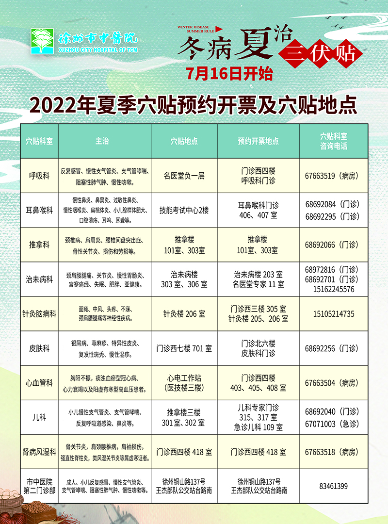 黃淮網(wǎng) 冬病夏治三伏貼,7月16日即將開貼!即日起,徐州市中醫(yī)院相關(guān)穴貼門診:呼吸科、耳鼻喉科、推拿科、治未病科、針灸腦病科、兒科、皮膚科、心血管科、腎病風濕科、中醫(yī)院第二門診部等科室全面接受預約、開單,請市民朋友提前前往相關(guān)科室開單繳費,以免到時人多排隊擁擠。