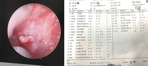 術(shù)后,患者鼻內(nèi)鏡檢查創(chuàng)面愈合完好,各個(gè)血象恢復(fù)正常。