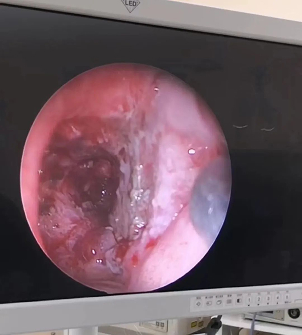 經(jīng)過充分的術(shù)前準(zhǔn)備,由王浩主任主刀,宋巍主任、耿亮、楊靜主治醫(yī)師為助手,在麻醉科和手術(shù)室護(hù)理組的積極配合下,為朱先生行鼻內(nèi)鏡下探查術(shù),憑借多年的臨床經(jīng)驗(yàn),王浩內(nèi)鏡下探查時(shí)發(fā)現(xiàn)為罕見的鼻咽巨大膿囊腫并非鼻咽癌,“進(jìn)去時(shí),發(fā)現(xiàn)膿囊腫充滿鼻咽腔,完全堵塞后鼻孔,造成患者經(jīng)鼻呼吸困難,只能張口呼吸,鼻咽部附著大量膿痂,很難看清重要結(jié)構(gòu)的位置,所以很危險(xiǎn)。巨大膿囊腫壓迫左側(cè)咽鼓管咽口,而造成左鼓室積液,患者左耳聽力嚴(yán)重下降。” 為了明確診斷,活檢鉗取多塊鼻咽腫物送快速病理檢查,病理科主任趙雨占的快速病理明確診斷傾向于炎癥,種種診斷表明不是癌癥后,王浩在鏡下完美地切除鼻咽部巨大膿囊腫。