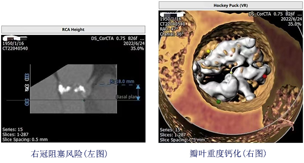 趙躍武對患者病情充分評估后,也認(rèn)為必須行TAVR術(shù),但同時也發(fā)現(xiàn)了幾個難題。第一,患者的右冠開口有一團(tuán)增生鈣化的瓣葉組織,一旦人工瓣膜釋放,極有可能擠壓這個團(tuán)塊阻塞冠脈,造成致命性風(fēng)險。第二,主動脈根部鈣化極重,在Hu850水平鈣化達(dá)1244mm³,是趙躍武既往所有參加過的手術(shù)中鈣化最重的一例。這種鈣化會大大增加瓣葉和瓣環(huán)撕裂的風(fēng)險。第三,患者術(shù)前心電圖即存在 “完全性右束支傳導(dǎo)阻滯”,瓣膜釋放后,一旦擠到左束支,即有可能出現(xiàn)完全性房室傳導(dǎo)阻滯,需要永久起搏器植入。