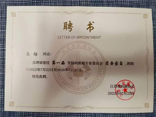 江蘇省抗癌協(xié)會胃腸間質(zhì)瘤專委會是江蘇省內(nèi)首個以胃腸道間質(zhì)瘤為專業(yè)方向的省級學術(shù)團體,在江蘇省人民醫(yī)院徐澤寬教授的帶領下成立,全省范圍內(nèi)選舉產(chǎn)生常務委員13名、委員40名,徐醫(yī)附院高超主任當選常務委員,宋虎副主任、孟閆凱副主任當選委員。