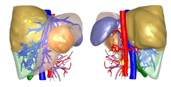 肝海綿狀血管瘤是一種良性腫瘤,常見于中年女性,多為單發(fā),也可多發(fā)。瘤體增大后,可能壓迫周圍器官出現(xiàn)腹脹,消化不良,噯氣甚至貧血和凝血功能異常。位于邊緣部位的瘤體,還有破裂,大出血的風(fēng)險。目前,手術(shù)切除是治療肝血管瘤最有效的方法。傳統(tǒng)開腹肝臟手術(shù)需在患者腹部切開一25~30cm左右的倒“L”或人字型切口,創(chuàng)傷大。而利用現(xiàn)代腹腔鏡技術(shù),則僅需在患者腹部切開5個0.5~1cm的戳孔就可以完成傳統(tǒng)手術(shù)同樣的操作,優(yōu)勢明顯。但是由于肝臟的富血供特征及解剖結(jié)構(gòu)的復(fù)雜性,腹腔鏡下肝臟手術(shù)特別是復(fù)雜肝切除手術(shù)目前只能在少數(shù)醫(yī)療機構(gòu)開展。