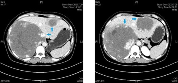 臨床上,病灶直徑10㎝以上就屬于巨大肝血管瘤。本例患者肝血管瘤共兩枚,分別位于肝左右葉,其中肝右葉瘤體直徑超過20cm,而肝左葉瘤體直徑也達到9cm,瘤體總體積甚至遠超殘余肝臟體積。而右葉瘤體又發(fā)生于肝臟S7、8段,是腹腔鏡肝臟手術(shù)最困難的區(qū)域。由于瘤體巨大,壓迫膈肌,致膈肌上抬,同時擠壓人體最粗的血管下腔靜脈和腹主動脈,使其受壓變形并移位。瘤體在肝內(nèi)則緊鄰菲薄的右肝及中肝靜脈,并且與入肝血流的門戶——第一肝門關(guān)系密切。術(shù)中一旦損傷上述血管,就會導(dǎo)致難以控制的大出血,氣體栓塞,肝功能衰竭等危及生命的并發(fā)癥。同時由于瘤體巨大,在手術(shù)切除瘤體過程中又要盡量保留正常肝臟組織的體積及功能;颊呒韧袃纱螊D科手術(shù)史,腹腔粘連也是微創(chuàng)手術(shù)操作的攔路虎。但考慮到患者是年輕女性,對美觀及微創(chuàng)有著強烈的愿望。劉斌、魏鑫團隊在進行充分評估及術(shù)前準(zhǔn)備后仍決定為患者實施腹腔鏡手術(shù)。2022年8月2日,手術(shù)在馬萬林麻醉團隊低中心靜脈壓控制、自體血回輸?shù)谋U舷潞投规面玫茸o理團隊的精準(zhǔn)配合下取得了圓滿成功;颊咝g(shù)后第一天即下床活動進并進食流質(zhì)飲食,1周后拔除引流管出院。