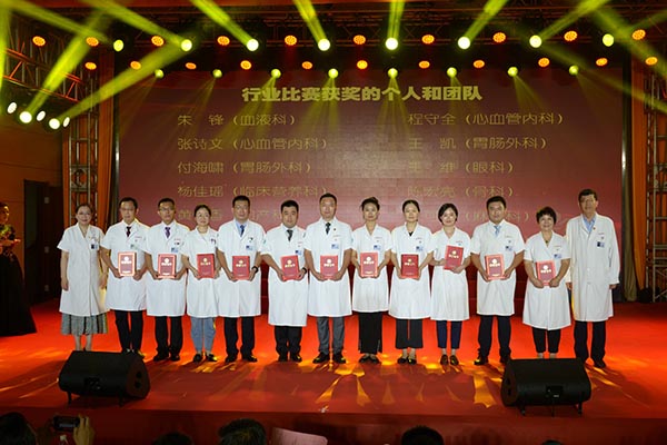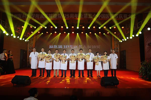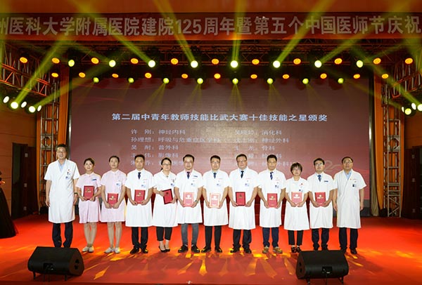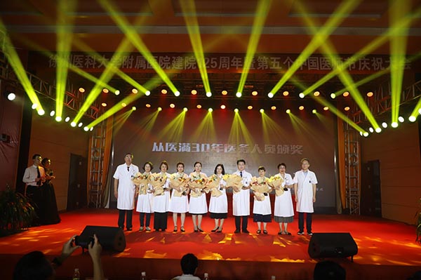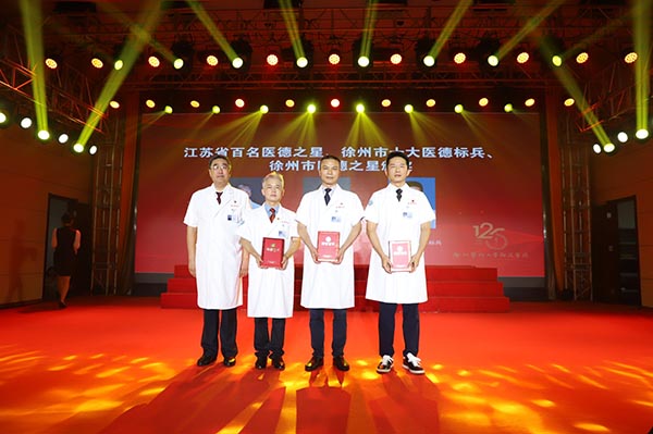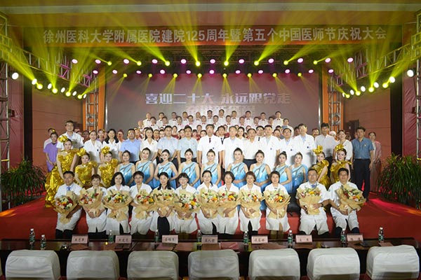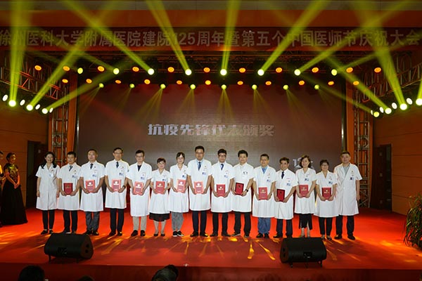 慶祝大會(huì)分為傳承、致敬、奮進(jìn)三個(gè)篇章。大會(huì)為從醫(yī)30年的19位醫(yī)務(wù)人員頒發(fā)了榮譽(yù)獎(jiǎng)杯和證書,為榮獲江蘇省百名醫(yī)德之星、徐州市十大醫(yī)德標(biāo)兵、徐州市醫(yī)德之星、江蘇省文明職工、徐州市十大杰出青年的醫(yī)務(wù)人員,抗疫先鋒代表,第二屆中青年教師技能比武大賽十佳技能之星,以及一年來在行業(yè)比賽獲獎(jiǎng)的個(gè)人和團(tuán)隊(duì)代表進(jìn)行了頒獎(jiǎng)。大會(huì)現(xiàn)場連線了我院支援新疆克州人民醫(yī)院、支援新疆伊犁州友誼醫(yī)院、援陜西商州區(qū)人民醫(yī)院、援睢寧縣人民醫(yī)院的醫(yī)務(wù)人員。此時(shí),他們?nèi)匀粖^斗在支援醫(yī)療衛(wèi)生工作的崗位上,祝他們醫(yī)師節(jié)快樂!會(huì)議高潮迭起,反響強(qiáng)烈。