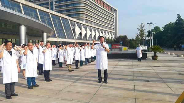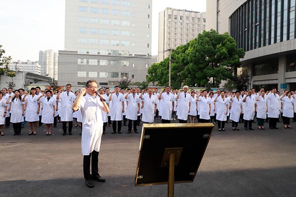 8月19日清晨,徐醫(yī)附院本部、東院同步舉行慶祝第五個(gè)“中國醫(yī)師節(jié)”升國旗和宣誓活動(dòng)。院長金培生在本部、副院長燕憲亮在東院,帶領(lǐng)醫(yī)務(wù)人員鄭重宣誓《中國醫(yī)師誓言》。“我宣誓:我志愿獻(xiàn)身人類的健康事業(yè)……”莊嚴(yán)的誓詞在耳邊響起,神圣的使命油然而生。日月輪回,斗轉(zhuǎn)星移,我們堅(jiān)守著醫(yī)乃仁術(shù)的真諦,我們踐行著醫(yī)者仁心的諾言……每一位在醫(yī)療領(lǐng)域深耕的醫(yī)務(wù)人員都應(yīng)得到最高的贊譽(yù)和尊敬。