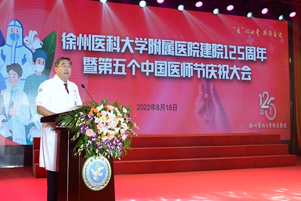 黃淮網(wǎng) 今年是黨的二十大召開之年,也是徐州醫(yī)科大學(xué)附屬醫(yī)院建院125周年。8月19日,我們迎來了第五個(gè)“中國醫(yī)師節(jié)”。今年醫(yī)師節(jié)的主題是“‘醫(yī)’心向黨、踔厲奮進(jìn)”。8月18日下午,“徐州醫(yī)科大學(xué)附屬醫(yī)院建院125周年暨第五個(gè)中國醫(yī)師節(jié)慶祝大會(huì)”在第一會(huì)議室舉行。大會(huì)回顧了醫(yī)院125年不平凡的發(fā)展歷程,表彰了從醫(yī)30年的醫(yī)師和在各個(gè)崗位上以及抗疫戰(zhàn)場上表現(xiàn)優(yōu)秀的同志們,展望了譜寫華章的光明前景。院領(lǐng)導(dǎo),從醫(yī)30年的醫(yī)師,受表彰的個(gè)人和代表,離退休和在職醫(yī)務(wù)人員代表,醫(yī)聯(lián)體單位睢寧分院、泗洪分院、賈汪分院的領(lǐng)導(dǎo)和代表,新疆奎屯醫(yī)院來院進(jìn)修的人員,新聞媒體記者等參加了慶祝大會(huì)。
