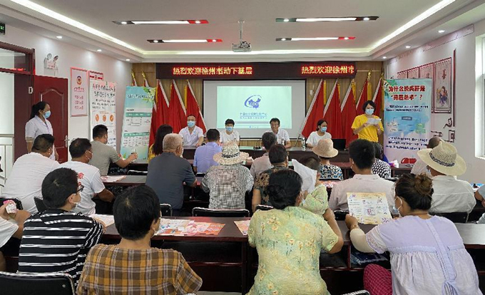 活動現(xiàn)場,劉臺村服務(wù)大廳門前懸掛“積極預(yù)防、主動檢測、規(guī)范治療”橫幅,大廳內(nèi)LED電子屏上顯示“積極檢測治愈 消除丙肝危害”標語;在培訓(xùn)教室設(shè)置問卷調(diào)查、咨詢和免費檢測、健康知識宣傳三個區(qū)域。上午9時活動開始,徐州疾控中心專家孫傳武為村民普及丙型肝炎的傳播途徑、流行現(xiàn)狀及防控策略,幫助村民提高防治意識,及時采取有效防護措施。
