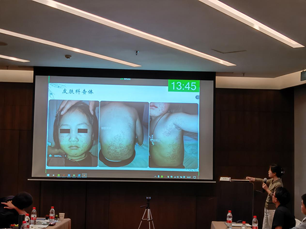 徐醫(yī)附院皮膚科孔姝婧醫(yī)生分享了“海姆泊芬光動(dòng)力治療鮮紅斑痣下肢病例”,徐州市第一人民醫(yī)院皮膚科張若晨醫(yī)生分享了“泛發(fā)性黃瘤合并家族性高膽固醇血癥病例”,徐州市中心醫(yī)院曹志成醫(yī)生分享了“非結(jié)核分枝桿菌皮膚感染病例”,徐州市第三人民醫(yī)院皮膚科錢(qián)冠宇醫(yī)生分享了“青少年誤用激素軟膏后的痤瘡病例”,賈汪區(qū)人民醫(yī)院路全勝主任分析了接種新冠疫苗后發(fā)生的急性蕁麻疹的病例,徐州市中醫(yī)院皮膚科張翠俠主任詳細(xì)介紹了中醫(yī)外治療法在皮膚科的應(yīng)用,徐醫(yī)附院皮膚科張警兮醫(yī)生主要分享了“有關(guān)兒童疹的特殊病例”,邳州人民醫(yī)院皮膚科林笑醫(yī)生分享了“瘙癢性丘疹汗孔角化癥病例”,最后徐州市中心醫(yī)院皮膚科的李晶冰主任分享了“壞疽性膿皮病的生物治療”。