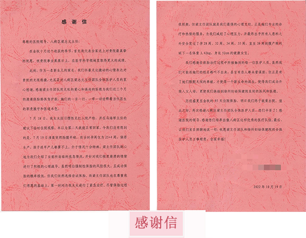 從夏日炎炎到丹桂飄香,他們?cè)凇陡兄x信》中寫(xiě)到:“感謝梁主任團(tuán)隊(duì)用無(wú)私的愛(ài)心和高尚的醫(yī)德為我們近三個(gè)月的漫漫保胎路保駕護(hù)航,她們的言愛(ài)行舉動(dòng),詮釋著當(dāng)代醫(yī)生的職責(zé)操守和醫(yī)道本色。這段時(shí)間我們感謝在保胎治療過(guò)程中所接觸到的每一位醫(yī)護(hù)人員,使我們感受到徐州市婦幼保健院良好的醫(yī)風(fēng)和醫(yī)德。”
