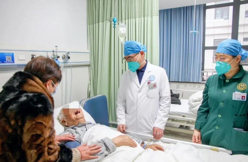 據(jù)張良介紹,這位百歲老人姓楊,他因“憋喘及胸悶2天”于2022年12月25日被收治入院。入院時(shí)嗜睡,指脈氧88%,口唇紫紺,患者既往有冠心病、心功能不全個(gè)人史20余年,腦梗死病史8年余,梗死后遺留右側(cè)肢體活動(dòng)差,長(zhǎng)期臥床。因該患者高齡,基礎(chǔ)病多,入院時(shí)的氧飽和度低于93%,張良及團(tuán)隊(duì)迅速作出老人有進(jìn)展為危重癥高風(fēng)險(xiǎn)的判斷。