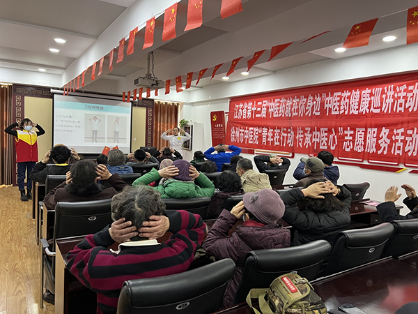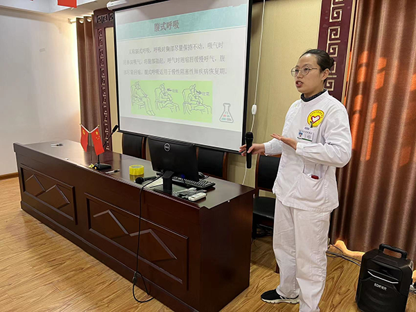 2月15日,徐州市中醫(yī)院志愿服務(wù)隊(duì)赴徐州市云龍區(qū)彭城街道蓮花社區(qū)進(jìn)行,此次講座的主題是 “呼吸操鍛煉”健康知識(shí)講座?祻(fù)科李婷婷醫(yī)生主要圍繞老年新冠患者康復(fù)后胸悶氣短等常見(jiàn)癥狀,通過(guò)圖文并茂、互動(dòng)教學(xué)的方法教授社區(qū)居民呼吸操(縮唇式呼吸、腹部呼吸)的訓(xùn)練方法,幫助其增強(qiáng)機(jī)體免疫力,改善肺功能。