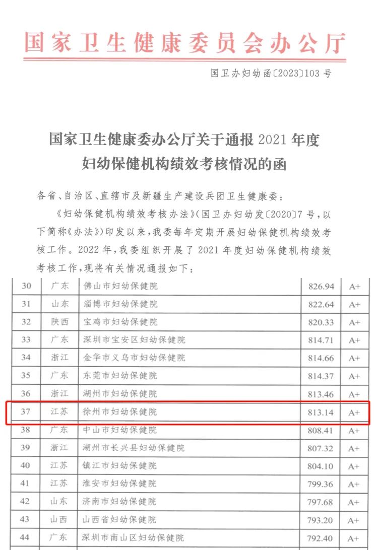 黃淮網(wǎng)(姚萌) 2023年4月10日,國(guó)家衛(wèi)生健康委員會(huì)公布了2021年度國(guó)家三級(jí)婦幼保健機(jī)構(gòu)績(jī)效考核結(jié)果,徐州市婦幼保健院在全國(guó)273家三級(jí)婦幼保健機(jī)構(gòu)中排名第37,相比2020年度上升兩個(gè)位次,國(guó)家檢測(cè)結(jié)果等級(jí)為“A+”,位列全省第四。