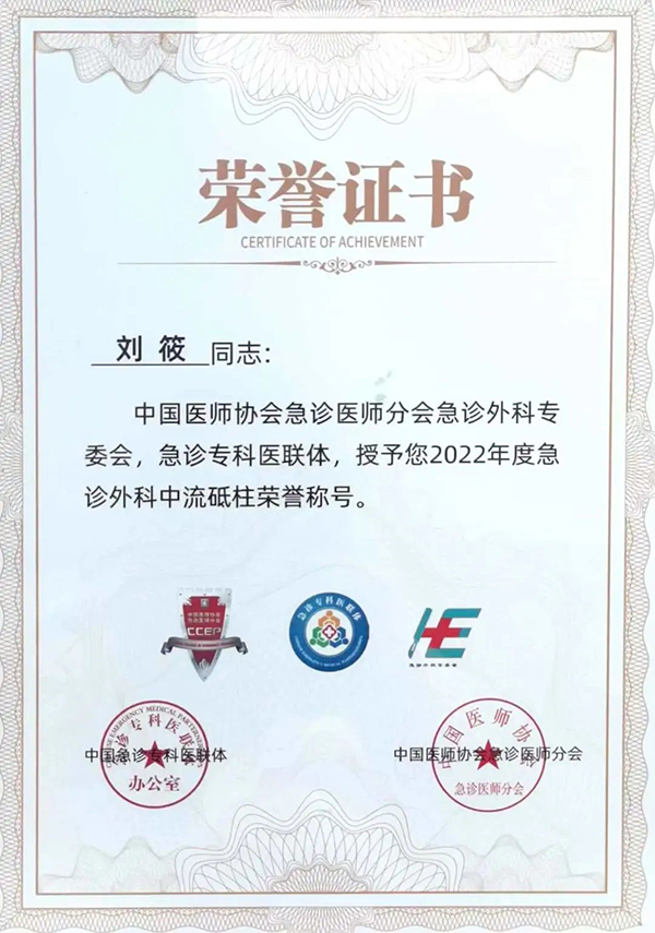 為表彰在全國(guó)急診外科工作中涌現(xiàn)出的一批先進(jìn)個(gè)人,大會(huì)特設(shè)置急診外科“中流砥柱”獎(jiǎng)項(xiàng)。經(jīng)過(guò)前期個(gè)人申報(bào)、急診外科專委會(huì)及中國(guó)醫(yī)師協(xié)會(huì)層層評(píng)選,徐州醫(yī)科大學(xué)附屬醫(yī)院醫(yī)務(wù)處處長(zhǎng)、急診醫(yī)學(xué)科劉筱博士榮獲“急診外科中流砥柱”榮譽(yù)稱號(hào)。獲此榮譽(yù)的全國(guó)僅10人,江蘇省僅1人。這既是對(duì)劉筱博士的褒獎(jiǎng),也是對(duì)徐醫(yī)附院急診創(chuàng)傷中心建設(shè)工作的認(rèn)可,更是國(guó)家級(jí)學(xué)會(huì)對(duì)徐醫(yī)附院高質(zhì)量發(fā)展的肯定。