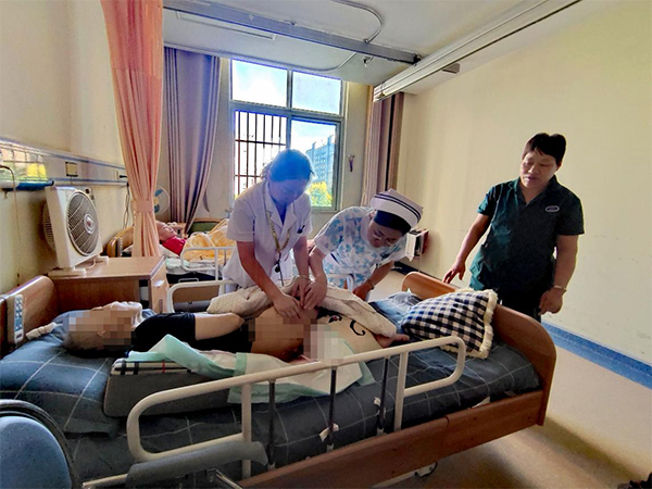 壓力性損傷小組組長李美娟科護(hù)士長對長期臥床老人失禁性皮炎的防護(hù)給予現(xiàn)場指導(dǎo)