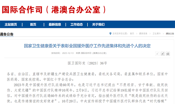 黃淮網(wǎng) 近日,國家衛(wèi)生健康委發(fā)布“關(guān)于表彰全國援外醫(yī)療工作先進(jìn)集體和先進(jìn)個人的決定”。為弘揚(yáng)中國醫(yī)療隊精神,表彰先進(jìn),樹立典型,經(jīng)中央批準(zhǔn),國家衛(wèi)生健康委決定,授予第29批援幾內(nèi)亞中國醫(yī)療隊等30個集體“全國援外醫(yī)療工作先進(jìn)集體”榮譽(yù)稱號,授予趙興山等60名同志“全國援外醫(yī)療工作先進(jìn)個人”榮譽(yù)稱號。