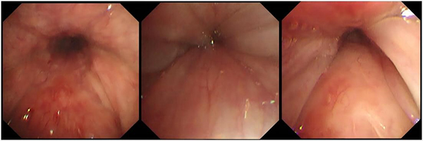 在呼吸與危重癥醫(yī)學(xué)科陳碧主任的主持下,經(jīng)過(guò)睡眠及呼吸內(nèi)鏡團(tuán)隊(duì)詳細(xì)討論,決定在呼吸內(nèi)鏡中心對(duì)兩位患者進(jìn)行藥物誘導(dǎo)睡眠內(nèi)鏡(Drug Induced Sleep Endoscopy,DISE)-壓力滴定治療。DISE是近年來(lái)逐漸發(fā)展起來(lái)的一項(xiàng)新技術(shù)。該技術(shù)通過(guò)藥物誘導(dǎo)OSAS患者進(jìn)入睡眠狀態(tài),再使用電子內(nèi)鏡動(dòng)態(tài)觀察患者睡眠狀態(tài)時(shí)上氣道塌陷部位及程度,同時(shí)分析與多導(dǎo)睡眠監(jiān)測(cè)儀監(jiān)測(cè)參數(shù)的關(guān)聯(lián)性,準(zhǔn)確判斷有無(wú)氣道阻塞及具體阻塞部位,給予個(gè)體化的治療方案。同時(shí),在DISE條件下進(jìn)行可視化的呼吸機(jī)壓力滴定,能直觀看到上氣道阻塞部位在呼吸機(jī)壓力滴定時(shí)的開放情況。另外,DISE還可以幫助醫(yī)生確定一些患者持續(xù)氣道正壓通氣治療失敗的原因;當(dāng)上氣道手術(shù)失敗時(shí),也可以通過(guò)DISE再次評(píng)估上呼吸道阻塞情況進(jìn)而尋找原因,制定相應(yīng)的補(bǔ)救措施。