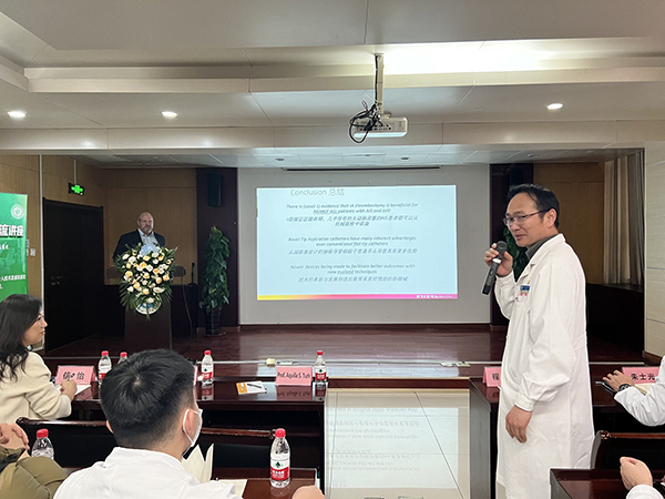 交流環(huán)節(jié),徐醫(yī)附院神經(jīng)內(nèi)科李海亮醫(yī)師做了疑難病例匯報(bào)。Aquilla S.Turk教授和與會(huì)專家們圍繞腦卒中患者檢查診斷、手術(shù)操作技巧、典型案例進(jìn)行了激烈的討論。
