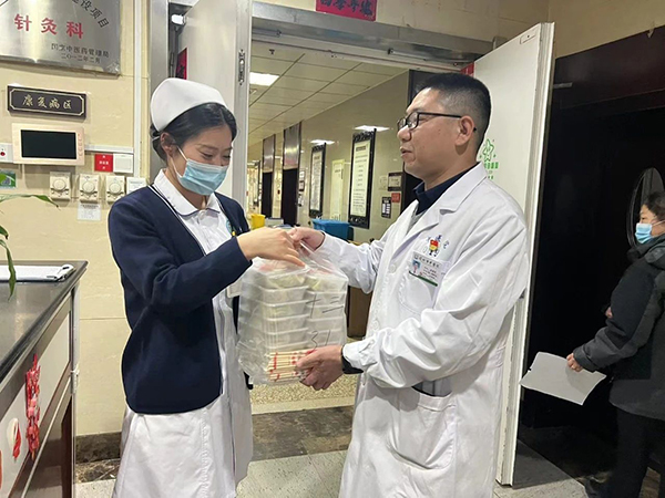 春節(jié)看望慰問(wèn)在崗醫(yī)務(wù)人員和住院患者是徐州市中醫(yī)院堅(jiān)持多年的傳統(tǒng)。為讓堅(jiān)守在院的醫(yī)護(hù)人員和不能回家過(guò)年的患者感受到濃濃的年味兒,大年三十下午,醫(yī)院領(lǐng)導(dǎo)還為每一位值班人員和住院患者送去香噴噴的水餃,讓大家在醫(yī)院過(guò)年也能感受到“家”一般的溫暖。