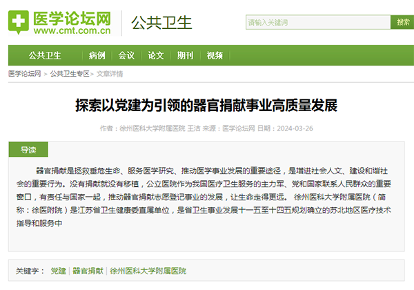 黃淮網(wǎng)(金杭)2024年3月,中國衛(wèi)生健康思想政治工作促進(jìn)會(簡稱“政促會”)公立醫(yī)院分會公布了2023年度黨建業(yè)務(wù)深度融合案例征集與評選結(jié)果,徐州醫(yī)科大學(xué)附屬醫(yī)院黨委第六黨總支報送的《探索以黨建為引領(lǐng)的器官捐獻(xiàn)事業(yè)高質(zhì)量發(fā)展》案例榮獲優(yōu)秀案例。