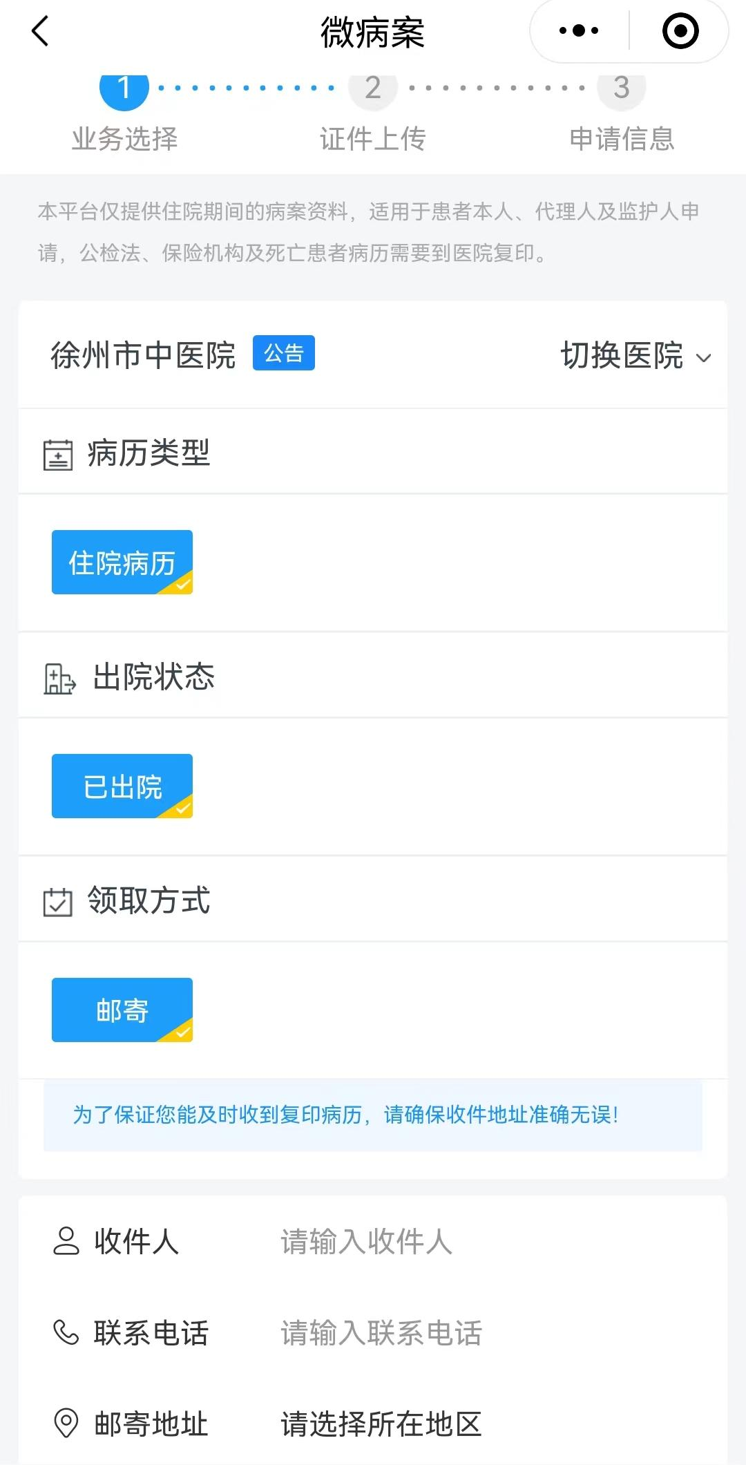 【郵寄】:付款成功后,徐州市中醫(yī)院將通過中國郵政EMS向申請人寄出病案資料。