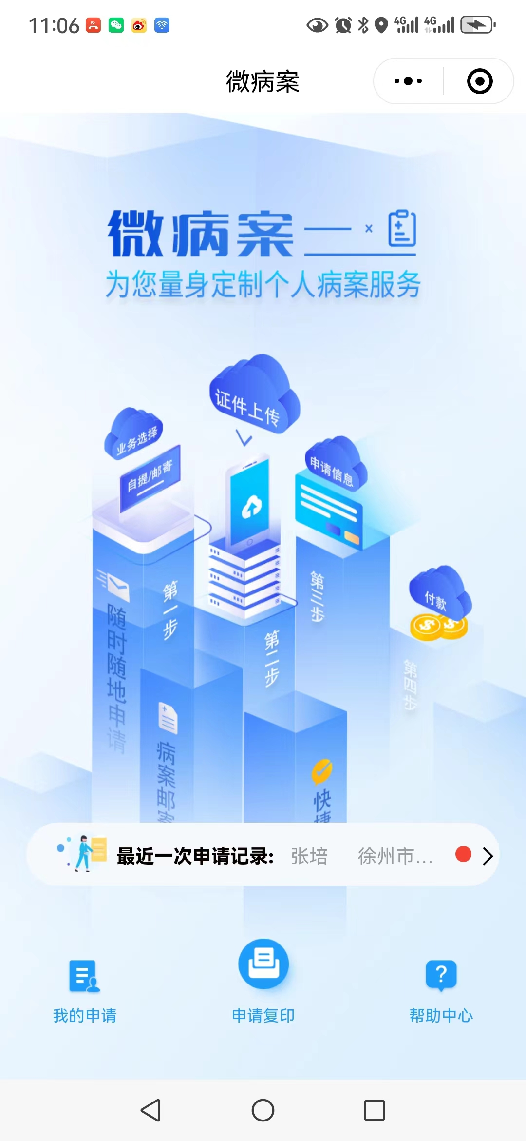 申請人于患者出院10個工作日后(節(jié)假日順延),在【徐州市中醫(yī)院】微信公眾號【智慧醫(yī)院】菜單欄點擊【病案復(fù)印】,進(jìn)入微病案小程序后進(jìn)行申請。