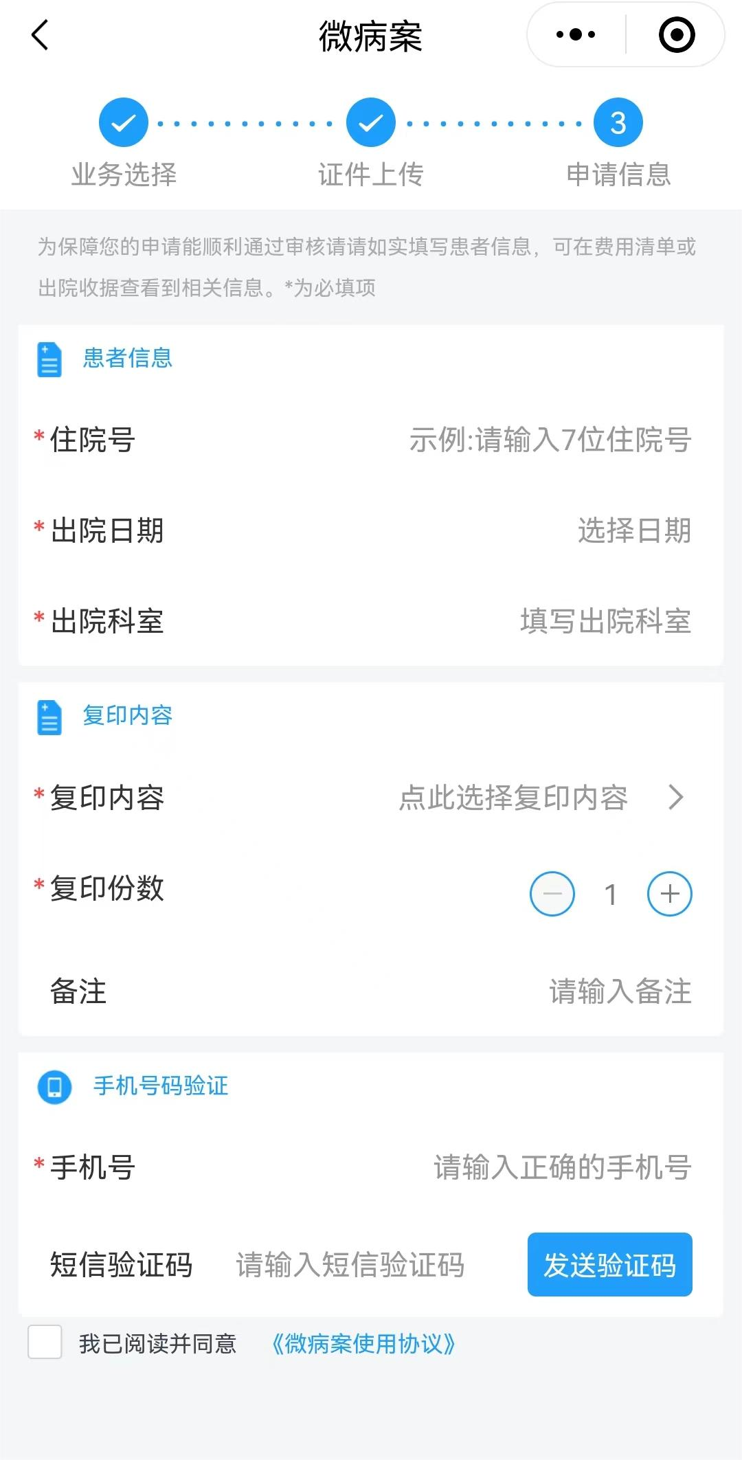 1. 點擊【申請復(fù)印】填寫申請內(nèi)容和住院信息,上傳照片
