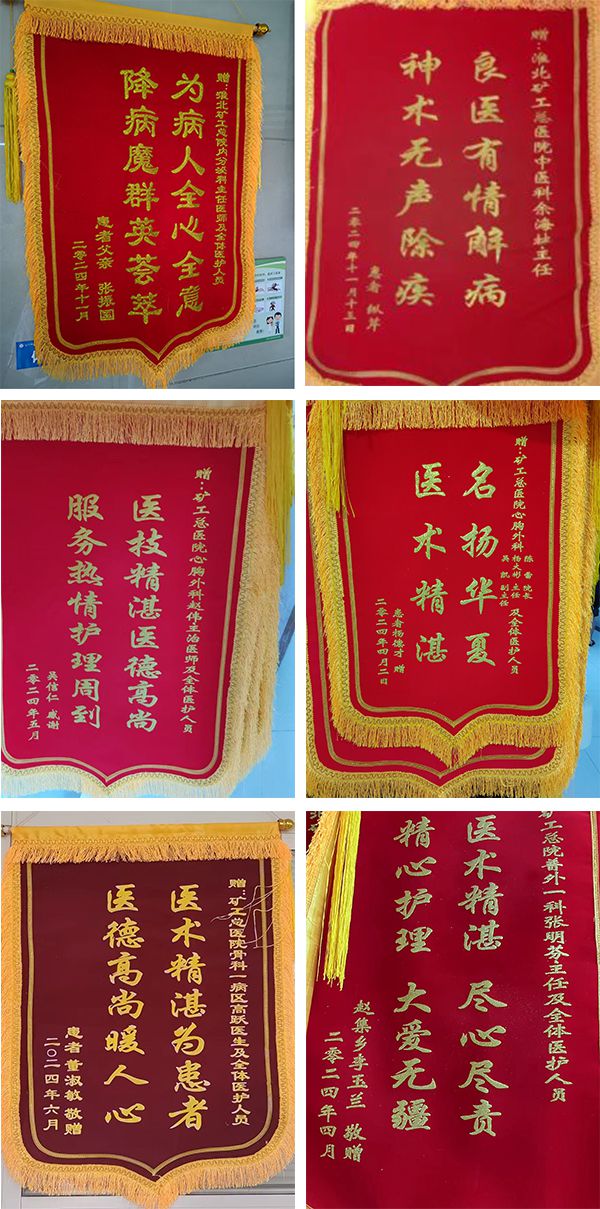 一面、兩面、三面錦旗(表?yè)P(yáng)信)受贈(zèng)數(shù)量不斷刷新著。一面面錦旗就如同一面面鏡子,它不僅代表一份褒獎(jiǎng)、信任和贊許,更代表一份責(zé)任與激勵(lì);是對(duì)醫(yī)護(hù)人員技術(shù)和服務(wù)的肯定,也是對(duì)礦醫(yī)人的激勵(lì)和鞭策;幢钡V工總醫(yī)院將繼續(xù)以專(zhuān)業(yè)的技術(shù)、優(yōu)質(zhì)的服務(wù)造福更多的患者。