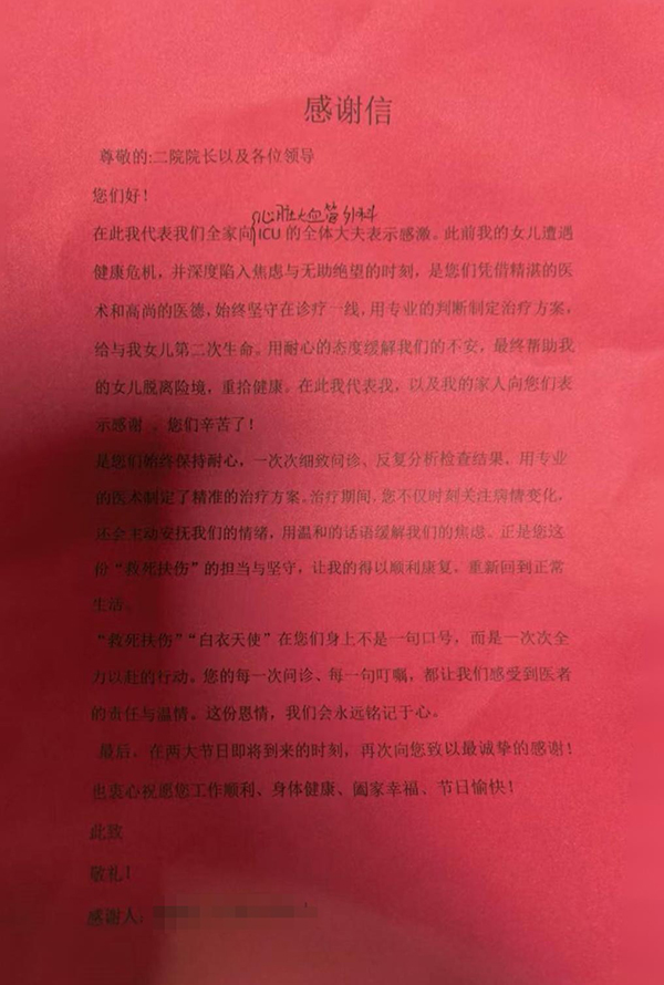 “是您們始終保持耐心,一次次細(xì)致問(wèn)診、反復(fù)分析檢查結(jié)果,用專(zhuān)業(yè)的醫(yī)術(shù)制定了精準(zhǔn)的治療方案。治療期間,您不僅時(shí)刻關(guān)注病情變化還會(huì)主動(dòng)安撫我們的情緒,用溫和的話(huà)語(yǔ)緩解我們的焦慮。正是您這份“救死扶傷”的擔(dān)當(dāng)與堅(jiān)守,讓我得以順利康復(fù),重新回到正常生活!”