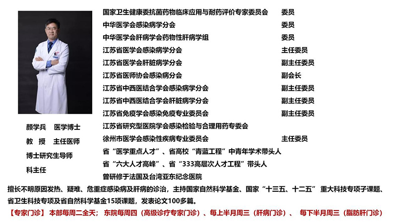 顏學(xué)兵教授長期專注于感染性疾病的臨床、教學(xué)及科研工作,在不明原因發(fā)熱、疑難重癥感染的診斷與治療、新發(fā)突發(fā)傳染病的防控以及抗菌藥物的合理應(yīng)用等領(lǐng)域積累了豐富的經(jīng)驗(yàn),取得了顯著的成果。此外,其所在的徐醫(yī)附院感染性疾病科為國家級臨床重點(diǎn)?平ㄔO(shè)項(xiàng)目單位、江蘇省級區(qū)域醫(yī)療中心(建設(shè)單位)、江蘇省臨床重點(diǎn)?。