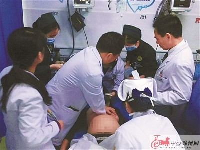 送患者來的人表示,患者突然暈倒,并發(fā)生抽搐。“面色青紫、無呼吸、無心跳……”急救中心的醫(yī)護人員對患者快速評估后,立即跪在推床上對該患者進行心臟按壓。就這樣,盡管急救中心大門距離急診室不到10米的距離,但由于猝死的黃金搶救時間只有短短的4分鐘,為了贏取寶貴的搶救時間,醫(yī)生跪在推床上邊給患者做胸外心臟按壓邊將患者轉(zhuǎn)運到急診室內(nèi)。