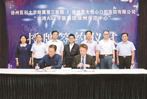 9月27日下午,徐州醫(yī)科大學(xué)附屬第三醫(yī)院(簡稱徐醫(yī)大附三院)與臺灣Abc牙醫(yī)集團(tuán)舉行技術(shù)合作簽約儀式,“臺灣Abc牙醫(yī)集團(tuán)徐州示范中心”同時掛牌。徐醫(yī)大附三院與臺灣Abc牙醫(yī)集團(tuán)共同搭建平臺,將專家、技術(shù)等優(yōu)勢醫(yī)療資源更大化,為徐州市民提供更為便捷、優(yōu)質(zhì)的醫(yī)療服務(wù)。