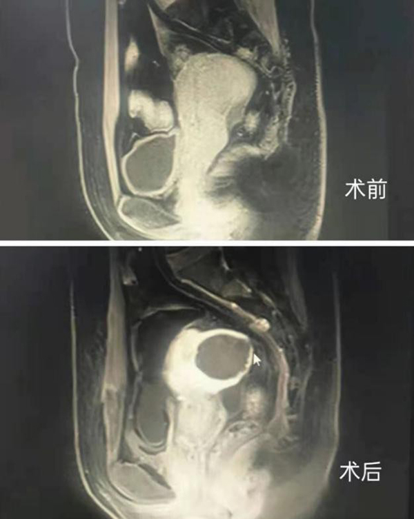 術(shù)中患者接受靜脈麻醉鎮(zhèn)靜鎮(zhèn)痛,全程基本保持清醒狀態(tài),無明顯痛感,生命體征平穩(wěn),并不時與醫(yī)生交流感受。手術(shù)順利完成。治療后潘女士進行盆腔磁共振檢查,與術(shù)前檢查進行效果評價,病灶凝固后出現(xiàn)明顯的低信號改變,治療效果非常滿意。