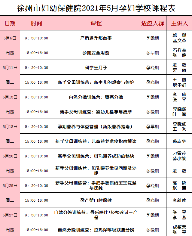 徐州市婦幼保健院 || 準(zhǔn)媽媽,孕婦學(xué)校5月課表請查收