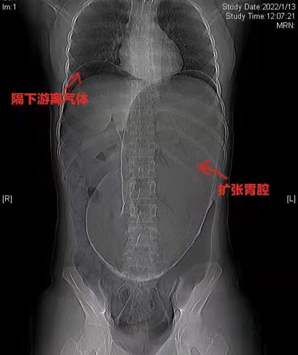 黃淮網(wǎng) 20222年1月13日,伴隨著急促的救護(hù)車鳴笛聲,徐州醫(yī)科大學(xué)附屬醫(yī)院急診中心接診了一位特殊的患者。一位年輕的女性,肚脹如鼓,腹痛難忍。急診外科迅速完善初步檢查并聯(lián)系胃腸外科會診。此刻,時間就是花季少女的生命!胃腸外科張秀忠主任團(tuán)隊(duì)立刻投入到緊張有序的治療中。經(jīng)過問診、查體、影像學(xué)檢查等綜合診斷后判定患者胃腔極度擴(kuò)張、膈下游離氣體,提示消化道穿孔。此時患者已有休克表現(xiàn),病情危急,隨時有生命危險,需急診手術(shù)處理。