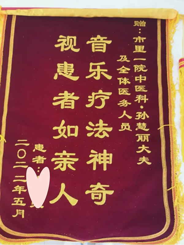 出院一個月后復(fù)診,兩位老人的肢體功能和精神狀態(tài)都在繼續(xù)改善中。樸實的姚老先生熱情地送來一面錦旗“音樂療法神奇”。