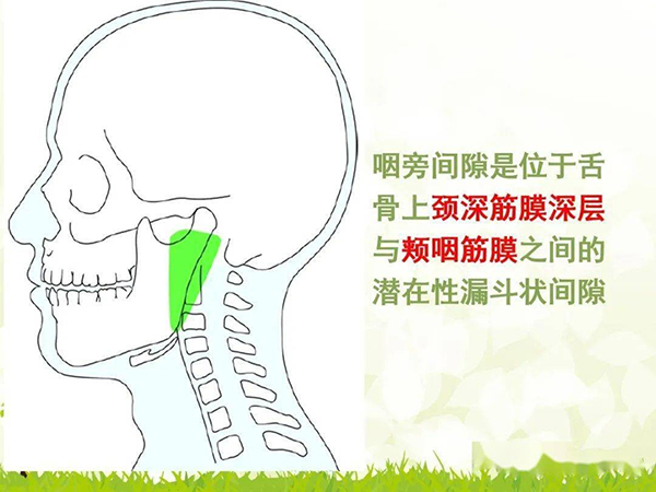 咽旁間隙上抵顱底,下達(dá)舌骨平面;前界為翼下頜韌帶、頜下腺上緣;后界為椎前筋膜。由莖突及莖突諸肌將此間隙分為前后二部。前部稱咽旁前間隙;后部稱咽旁后間隙。咽旁前間隙較小,咽升動(dòng)、靜脈行于其中,內(nèi)側(cè)有咽上縮肌及腭扁桃體。腭扁桃體感染可侵及該間隙。咽旁后間隙較大,內(nèi)有頸內(nèi)動(dòng)、靜脈及第Ⅸ-Ⅻ腦神經(jīng)及頸深上淋巴結(jié)。咽旁間隙巨大脂肪瘤臨床較罕見,手術(shù)切除是較理想的治療措施。咽旁間隙腫物早期可無明顯臨床表現(xiàn),腫物增大可表現(xiàn)出呼吸道阻塞癥狀,如睡眠打鼾、張口呼吸等,重者可出現(xiàn)呼吸困難。