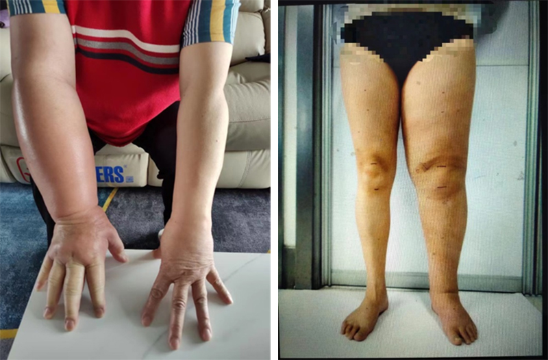 大多數(shù)患者最先表現(xiàn)為雙側(cè)肢體的不對(duì)稱,進(jìn)而可出現(xiàn)肢體的酸脹、沉重、無(wú)力或者疼痛,隨著水腫的發(fā)展,腫脹逐漸加重,皮膚出現(xiàn)纖維化、過(guò)敏、反復(fù)感染等情況,嚴(yán)重者可能進(jìn)展成為橡皮腫。上肢水腫會(huì)導(dǎo)致關(guān)節(jié)受限,影響手指的精細(xì)活動(dòng);下肢水腫容易并發(fā)會(huì)陰水腫,影響步行功能。