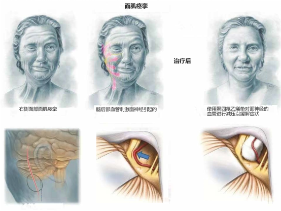 面肌痙攣(Hemifacial Spasm)是一種因面部神經(jīng)受到血管壓迫或其他刺激而引起的面部肌肉不自主抽搐的疾病。這種抽搐可以表現(xiàn)為眼皮跳動(dòng)、口角抽動(dòng)等多種形式,嚴(yán)重時(shí)甚至?xí)绊懟颊叩囊暳驼Z言能力。而面神經(jīng)微血管減壓手術(shù)(MVD)則是一種針對(duì)面肌痙攣的有效治療方法。手術(shù)過程中,醫(yī)生會(huì)在患者的顱骨上開一個(gè)小洞,然后通過顯微鏡操作,找到受壓迫的面神經(jīng)和責(zé)任血管,并在它們之間墊上一個(gè)像棉花團(tuán)一樣的墊片,從而解除血管對(duì)神經(jīng)的壓迫。這樣一來,面部神經(jīng)就不再受到刺激,抽搐癥狀也會(huì)得到徹底緩解。