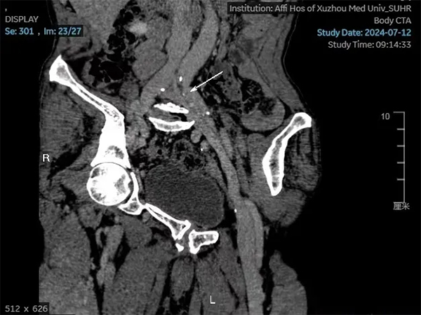 今年7月在兒子的陪同下戚大爺來到了徐州醫(yī)科大學(xué)附屬醫(yī)院介入放射科門診就診,也就是此次就診讓他的病情在30年后出現(xiàn)了轉(zhuǎn)機(jī)。在張慶橋主任的仔細(xì)詢問下,為其開具了相關(guān)檢查,下肢靜脈彩超顯示左下肢股靜脈及腘靜脈增寬伴靜脈瓣膜功能不全,CTA顯示左髂靜脈受壓。最終診斷為左髂靜脈壓迫綜合征。