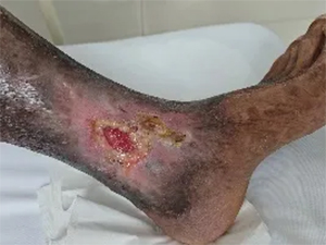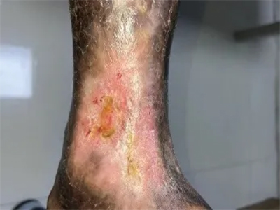 戚大爺今年72歲,30年前左小腿開始出現(xiàn)皮膚發(fā)黑,后來局部出現(xiàn)了潰爛,起初潰爛面積較小尚能自行愈合,后潰爛逐漸增大,反復(fù)破潰經(jīng)久不愈。他也曾就診于當(dāng)?shù)蒯t(yī)院,診斷為下肢靜脈曲張所致并行下肢靜脈曲張結(jié)扎治療。然而,小腿潰瘍并未得有效愈合,這對(duì)他的生活、工作造成了很大的困擾。為了避免感染,潰瘍傷口經(jīng)常換藥清創(chuàng)(圖1),耗費(fèi)了他大量的時(shí)間和精力。就這樣戚大爺與“老爛腿”“斗爭(zhēng)”了30年。