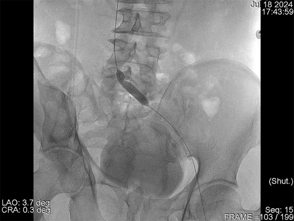 圖2 左髂靜脈受壓狹窄伴管壁鈣化,遠(yuǎn)端靜脈增寬