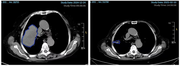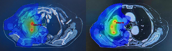 80歲的患者李女士(化名)2024年2月確診為右肺腺鱗癌,經(jīng)過(guò)靶向治療、化療后出現(xiàn)多次進(jìn)展。2024年12月24日查胸部CT提示右肺上葉病灶增大至95mm×64mm(圖1左側(cè)所示)?紤]腫瘤體積巨大,腫瘤內(nèi)部可能出現(xiàn)壞死、乏氧,常規(guī)放療難以取得理想的治療效果,并且大概率會(huì)對(duì)腫瘤周圍的心臟、肺、臂叢神經(jīng)等正常組織造成較大損傷,嚴(yán)重影響患者的生活質(zhì)量,腫瘤放療科副主任丁昕組織蔣愛(ài)軍主任醫(yī)師、李亮副主任物理師等團(tuán)隊(duì)成員進(jìn)行綜合評(píng)估和細(xì)致討論,決定采用空間分割放療技術(shù)。李女士整個(gè)療程接受了6次放療(常規(guī)放療一般至少需要30次),住院時(shí)間明顯縮短。治療結(jié)束后李女士自覺(jué)咳嗽癥狀明顯好轉(zhuǎn),1月后,2025年2月10日復(fù)查胸部CT提示右肺上葉的巨大腫瘤幾乎完全消失(圖1右側(cè)所示),取得了出乎意料的治療效果。