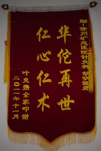 中國黃淮網(wǎng)訊(實習采編 鄧晨雨)2011年12月27日下午,本網(wǎng)站記者在徐礦總醫(yī)院針灸推拿科胡明主任的診室里看到一面新掛上的錦旗,上寫“華佗再世,仁心仁術”,是本市患者葉克攜全家送給胡明主任,表示感謝的。