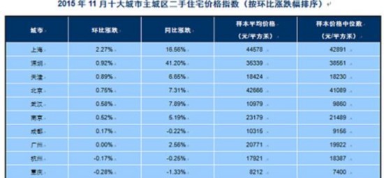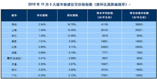 同比來看,報告顯示,全國100個城市(新建)住宅均價較去年同期上漲2.93%,漲幅較上月擴(kuò)大0.86個百分點(diǎn)。2015年11月,住宅價格同比2014年11月上漲的城市個數(shù)為34個,上漲城市個數(shù)較上月增加1個。其中,深圳上漲34.75%,仍居首位;武漢、上海、保定漲幅超過10.00%北京、珠海等23個城市漲幅介于1.00%-10.00%之間;淄博、長春等7個城市漲幅在1.00%以內(nèi)。