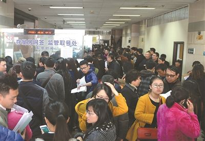 28日是位于南京市華僑路房產(chǎn)交易中心新的一周第一個(gè)交易日,交易中心人滿為患。市民只能慢慢地排隊(duì),在人縫中擠著行走。 吳俊攝