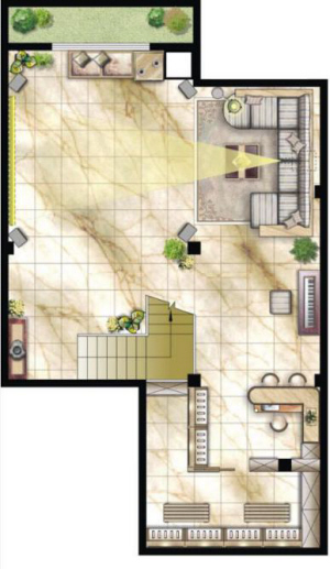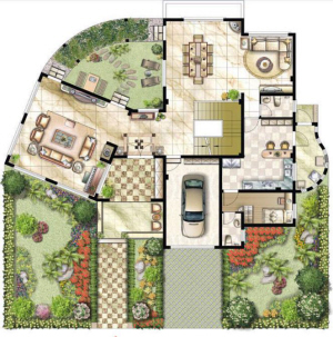 地上一層:回廊式入口,藏鋒聚氣。兼具私密性、安全性和觀景性,彰顯豪門氣度。270度全景觀落地窗與餐廳、起居室連為一體,將陽光引入客廳,自然美景與居家氣氛掩映成趣。