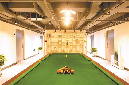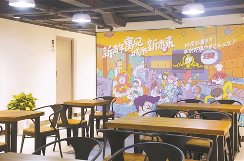 泊寓擁有工業(yè)風(fēng)格的裝修,簡約風(fēng)格的家具,并根據(jù)年輕人的審美與需要精心配置了生活必需品。記者在泊寓看到,每一層過道的墻壁上都有不同主題的彩繪。二樓公共區(qū)域還有書吧、影音室、休閑區(qū)、健身區(qū)等公共設(shè)施。